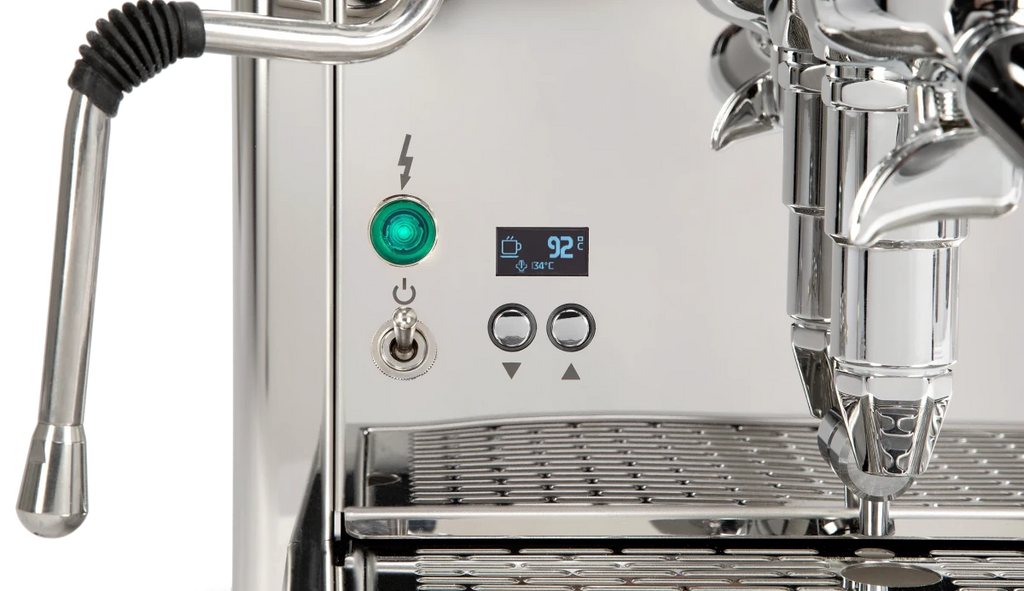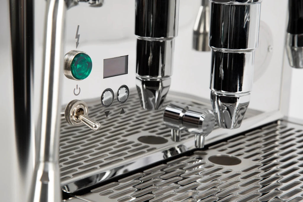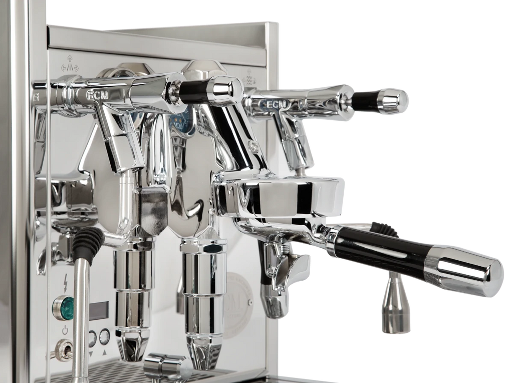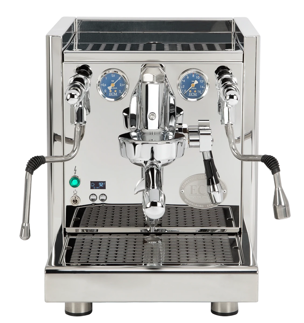 The ECM Technika VI is a dual-boiler machine that heats both boilers simultaneously. Combined with the Fast Heat-Up mode, cappuccino lovers can brew faster. The discreet display allows a variety of settings.