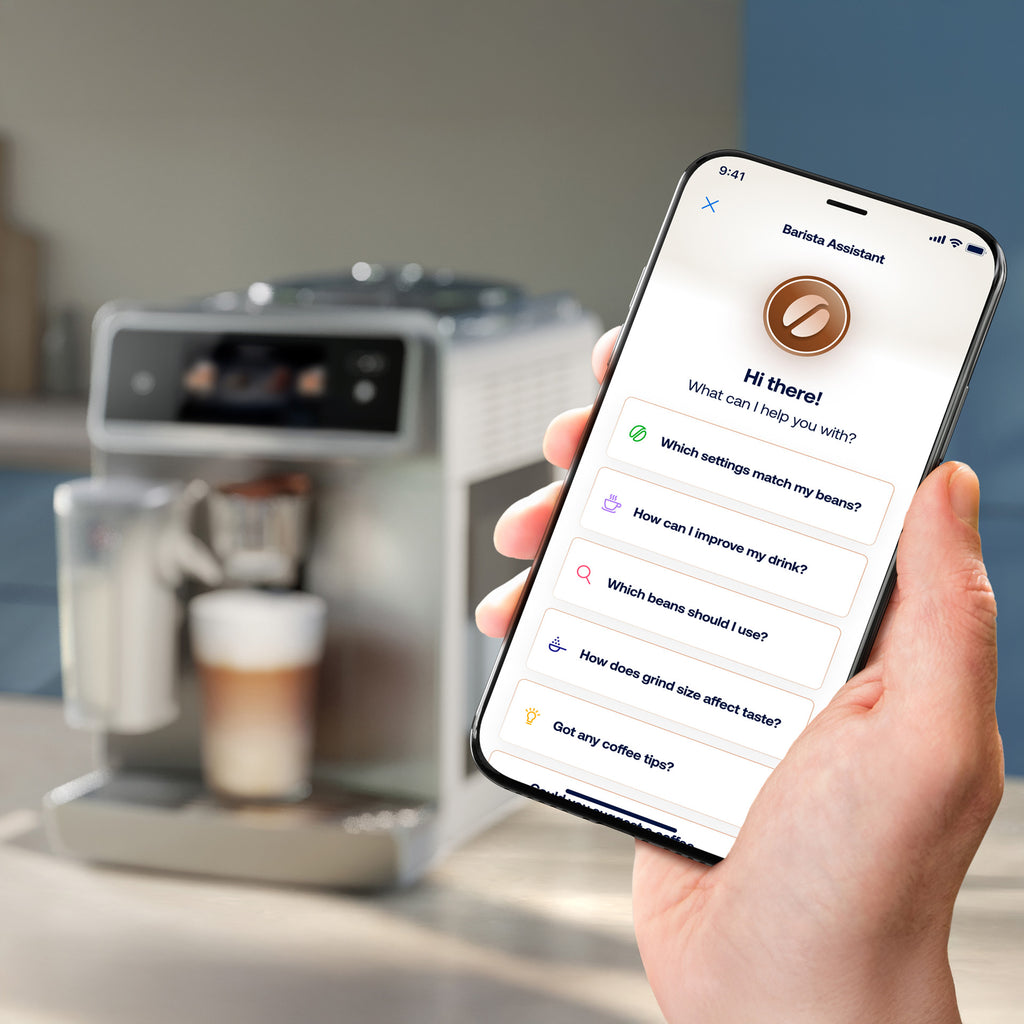 L'assistant barista intégré est là pour vous aider à obtenir le café parfait ! Indiquez-lui le type de grains utilisés et il ajustera automatiquement votre machine à café pour une dégustation optimale. Connectez-vous à l'application HomeID pour bénéficier de conseils encore plus personnalisés.